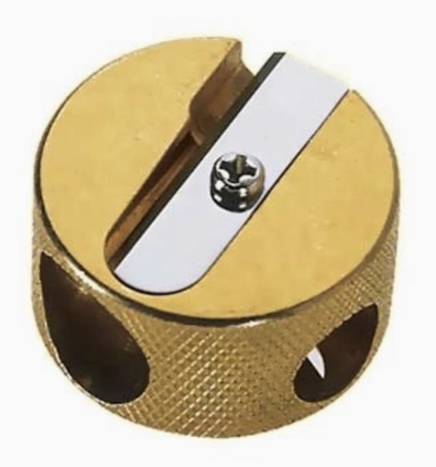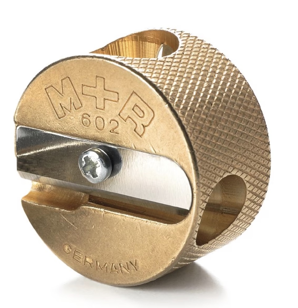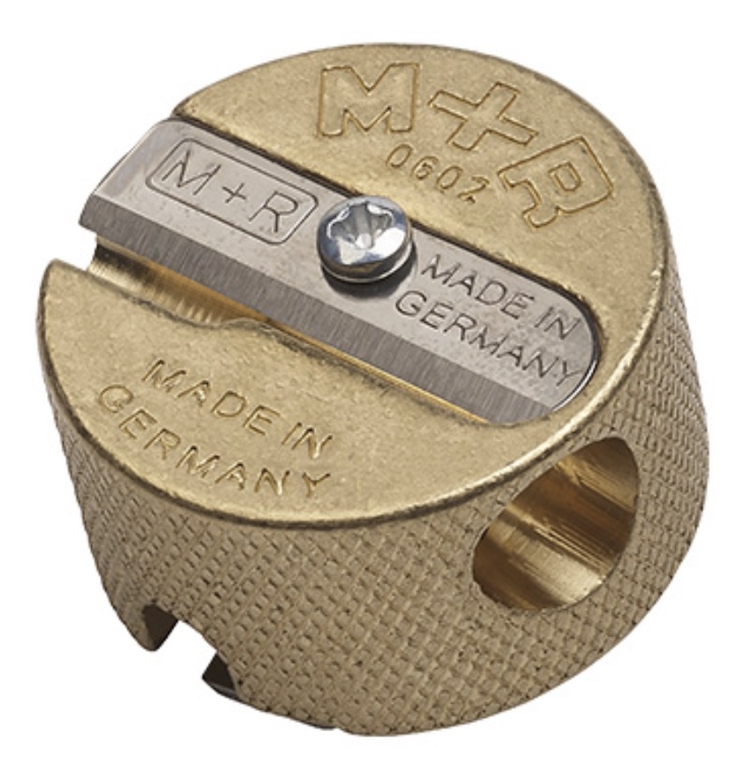 Topkwaliteit messing puntenslijper van Möbius & Ruppert. Speciaal geharde messen, zware messing behuizing. Geschikt voor dunne (8,4mm) en dikke potloden tot maximaal 11mm.