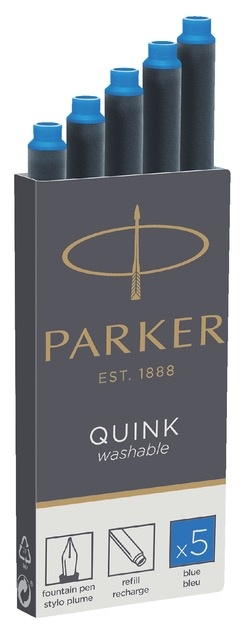 Doosje met 5 stuks Parker Quink vulpen patronen. Deze inkt is uitwasbaar (uit de meeste textiel soorten) en uitwisbaar met een inktwisser.
