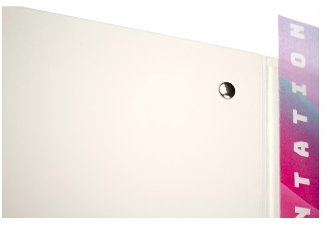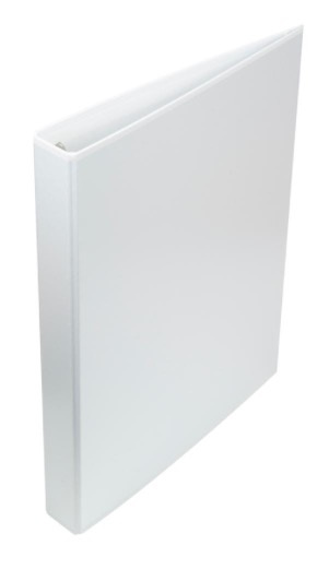 4 Rings presentatiemap, met voortas op de voorkant en een insteekhoes op de rug. Deze witte ringmap kun je dus naar eigen smaak personaliseren met prints of tekeningen op de voorkant en zijkant; je schuift er makkelijk een stuk papier in.
